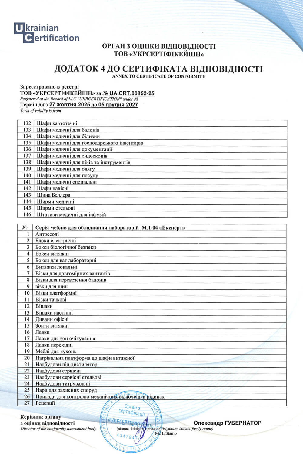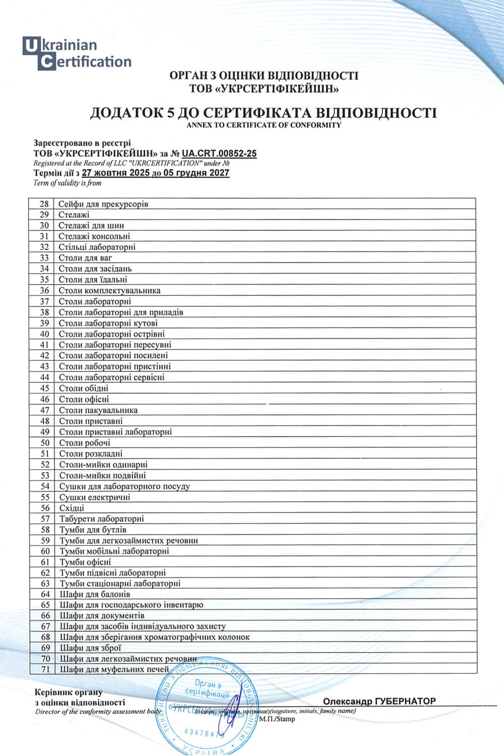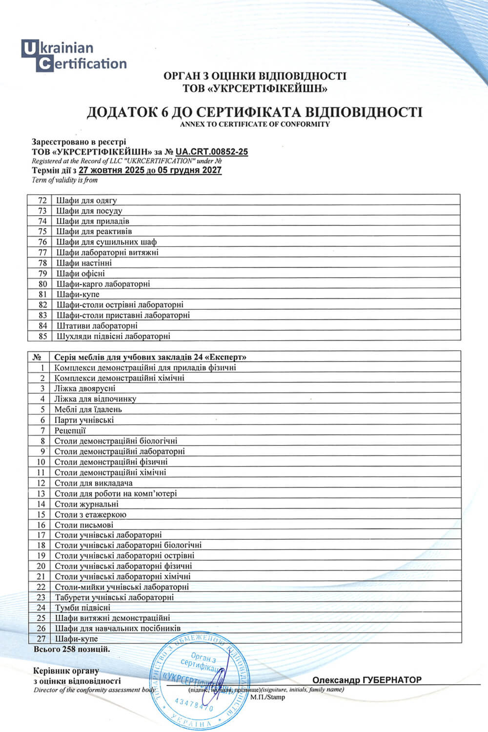 Меблі для лабораторій ТМ «Експерт» одні з небагатьох в Україні пройшли всі необхідні випробування за ДСТУ ГОСТ 16371-93, про що свідчать отримані сертифікати: гігієнічний сертифікат і сертифікат відповідності.