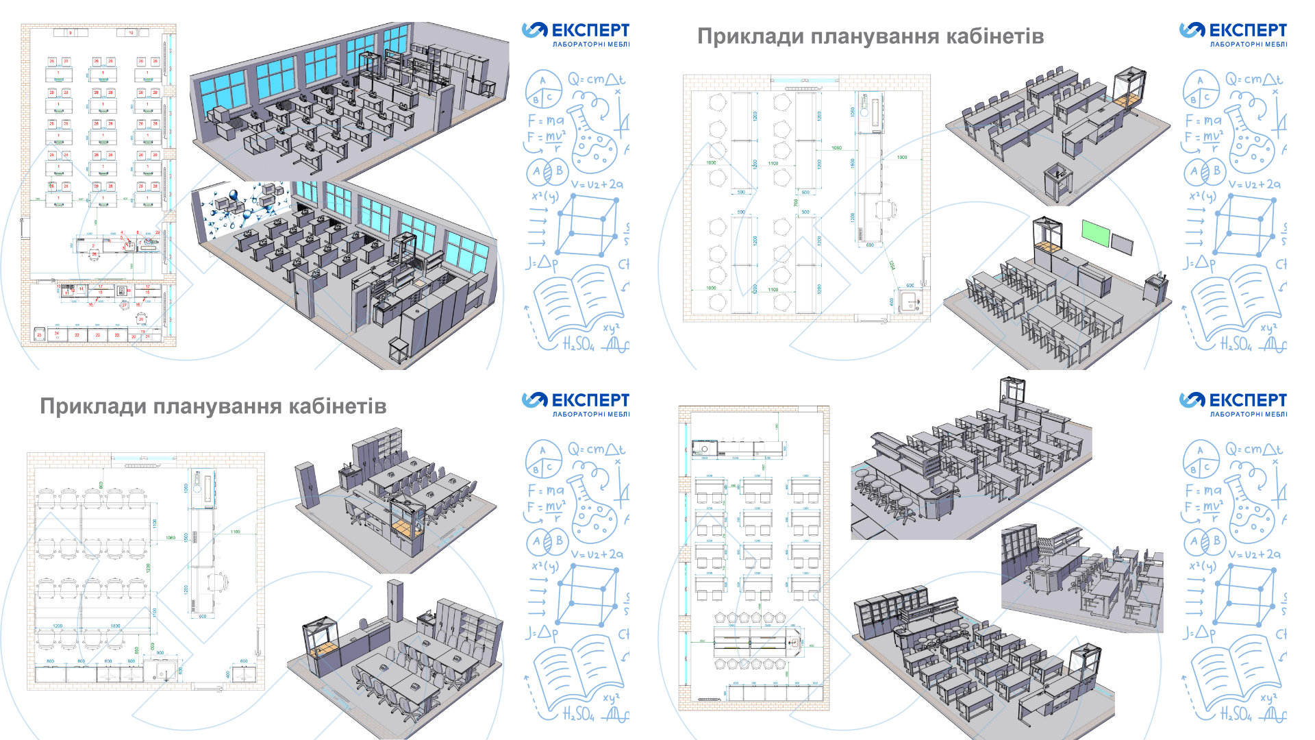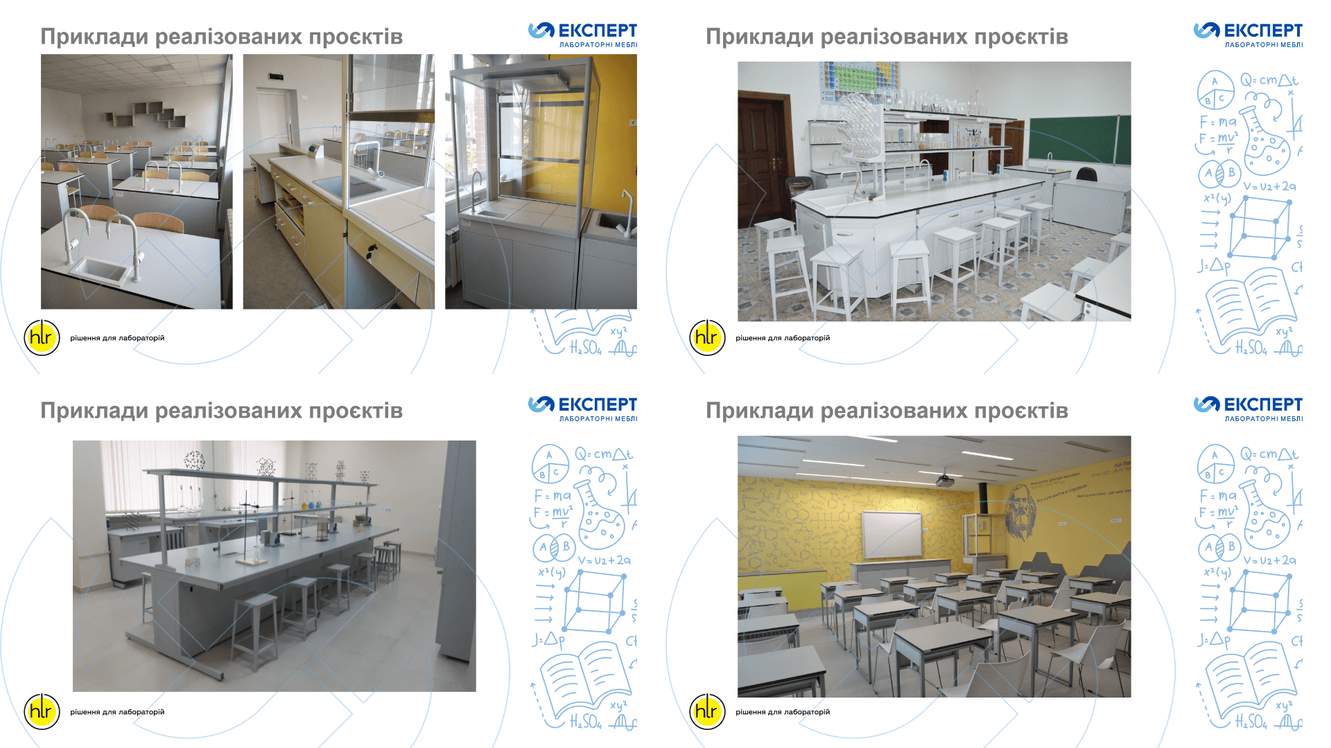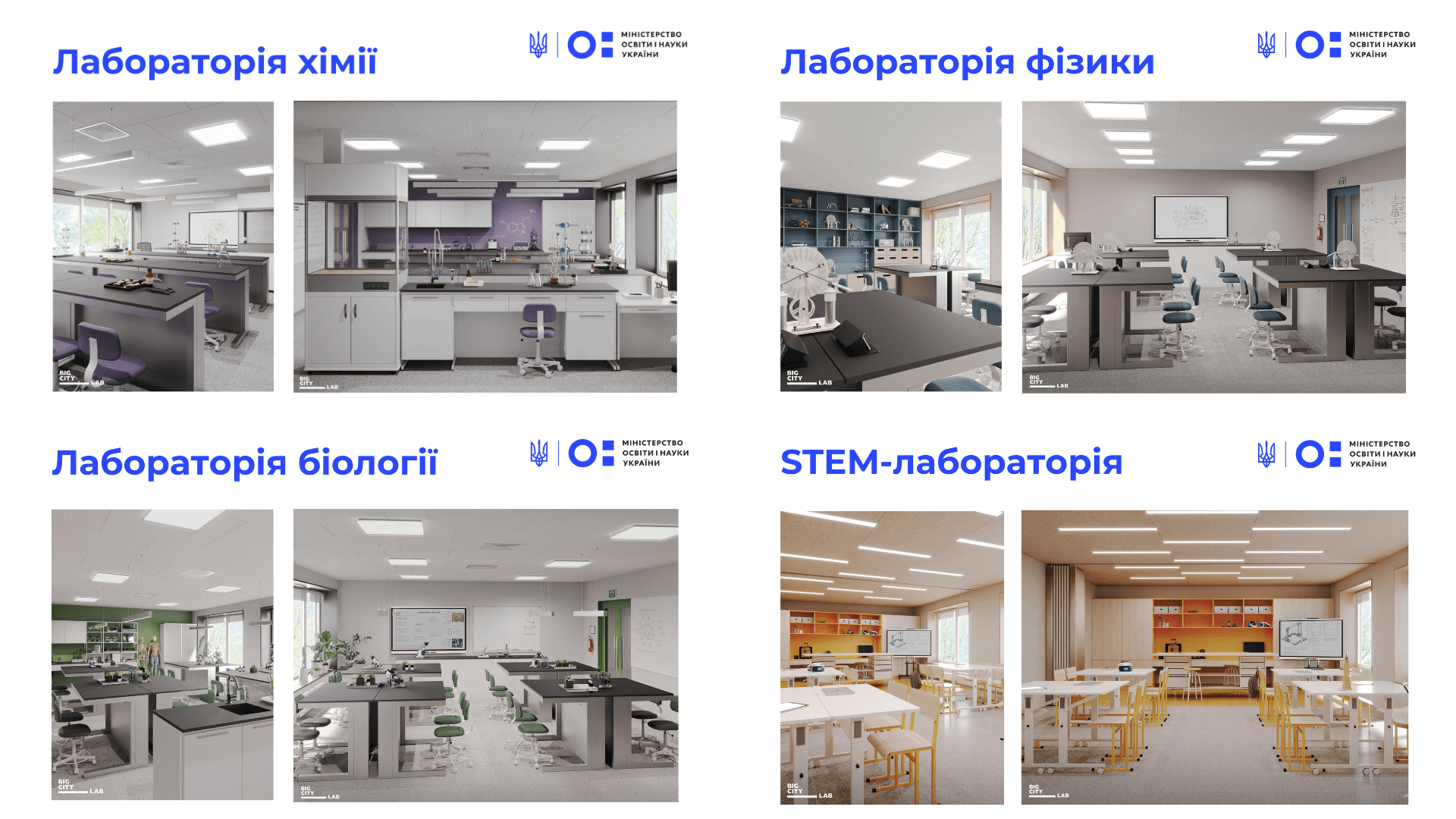 З прикладів лабораторій пілотного проєкту МОН (Міністерства Науки і Освіти України) видно, що меблі для кабінетів хімії, фізики, біології виглядають інакше. Меблі більше схожі на лабораторні, ніж на звичайні шкільні.